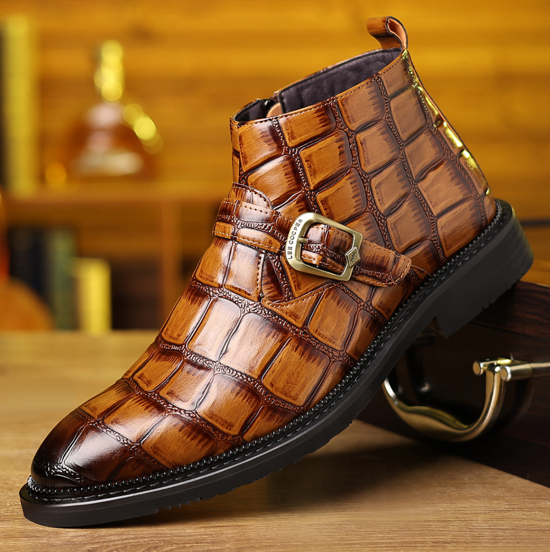 A distinctive ankle boot combining textured leather embossing with plaid fabric, built for secure wear, stability, and daily versatility across seasons.